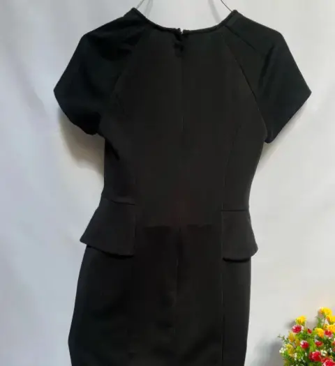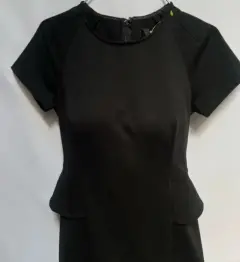 Vestido negro escote redondo, pinzas de busto en corte francés. Pequeño olan en en costado que abarca de pinza a pinza dela parte de la espalda. Manga ranglan corta y pinzas en hombro, cierre invisible y broche de seguridad. Falda corte lápiz. Talla: XS (22-24) Marca: MOSSIMO.