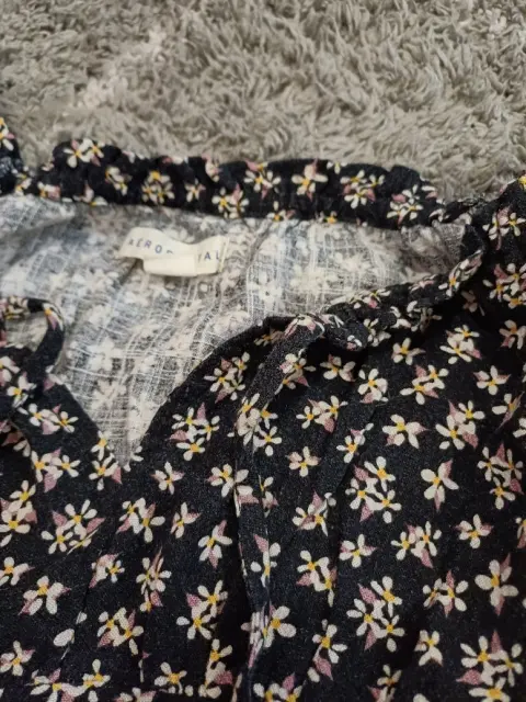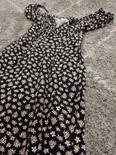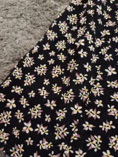 Hermoso vestido negro con florecitas blancas. Tiene cierre a un costado a la altura de la cintura. Tiene resorte en escote. La tela casi no estira. La tela es 80% rayón y 20% lino. Es ajustado debajo del busto.Medidas: ax a ax 44 cm, cintura 38 cm, largo 77 cm.