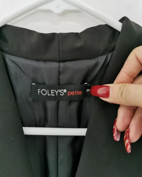 Vestido negro Foley's. Vestido camisero negro con forro. Cuello de solapa tipo traje. Con mangas de casquillo corte a la cintura con pinzas. Falda recta con acabado de tablones horizontales. Talla S.
