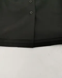 Vestido camisero negro con forro. Cuello de solapa tipo traje. Con mangas de casquillo corte a la cintura con pinzas. Falda recta con acabado de tablones horizontales. Talla S.