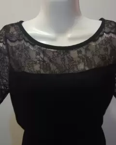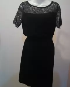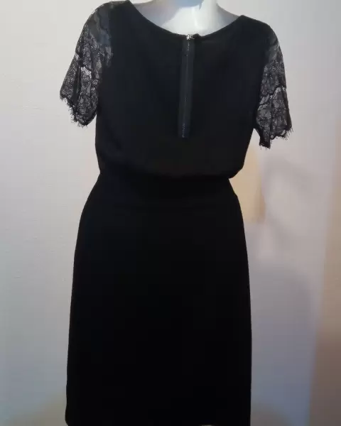 Vestido negro Loft. Vestido en tejido de punto, con resorte del mismo tejido en cintura, detalle de encaje en cuello (con forro de malla color nude) y mangas (sin forro) , cierre en espalda.Talla S Petite con las siguientes medidas:Ancho axila: 42.5 cmsAncho cintura: 30 cms (sin estirar)Largo total espalda: 86.5 cms