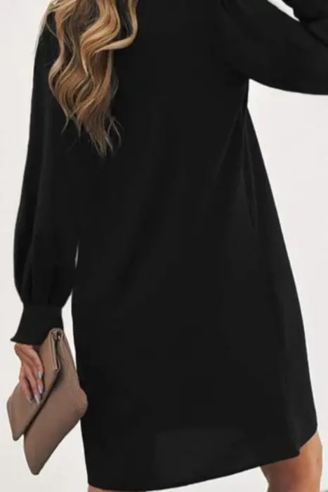 VESTIDO NEGRO MANGA LARGA. LA TELA NO ES TAN GRUESA PERO NO TRANSPARENTE, SE SIENTE DE BUENA CALIDAD.