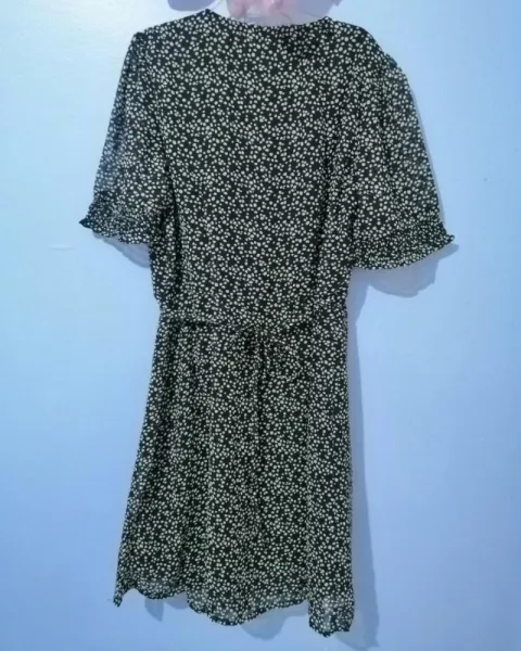 Vestido negro con puntos blancos, marca non stop a la rodilla, manga corta. Se ajusta a tu cuerpo con el listón