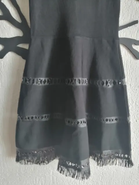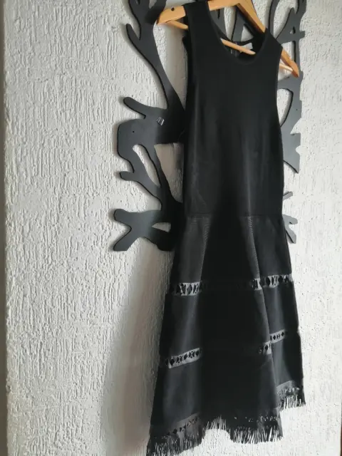 Vestido Negro PARKER Talla XS. Vestido Negro. Marca PARKER. Talla XS. La falda del vestido es circular y tiene unas aplicaciones en piel sintética en el mismo color negro al igual que un flequillo en el remate de la falda qué le dan un estilo étnico y campirano. Ideal para usar con botas vaqueras y para eventos como festivales de música. Es una pieza muy original, una joyita.