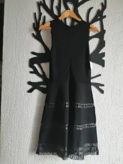 Vestido Negro. Marca PARKER. Talla XS. La falda del vestido es circular y tiene unas aplicaciones en piel sintética en el mismo color negro al igual que un flequillo en el remate de la falda qué le dan un estilo étnico y campirano. Ideal para usar con botas vaqueras y para eventos como festivales de música. Es una pieza muy original, una joyita.