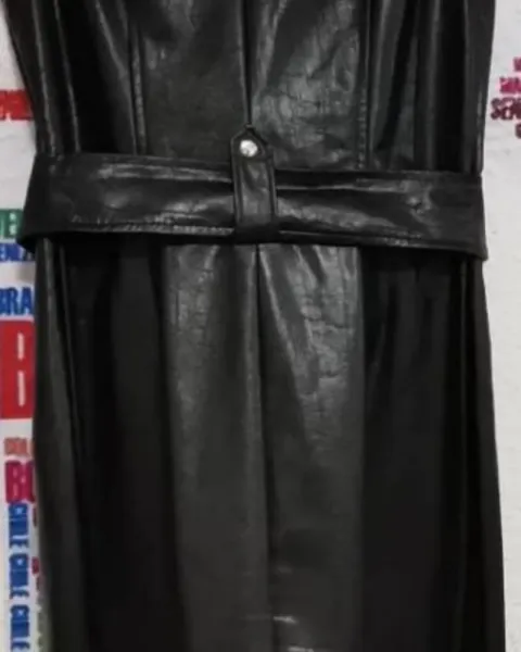 Vestido corto en color negro de POLIPIEL sin mangas con cierres en bolsillos falsos, con cinturón del mismo material y cinturón ajustable hace súper buena figura
