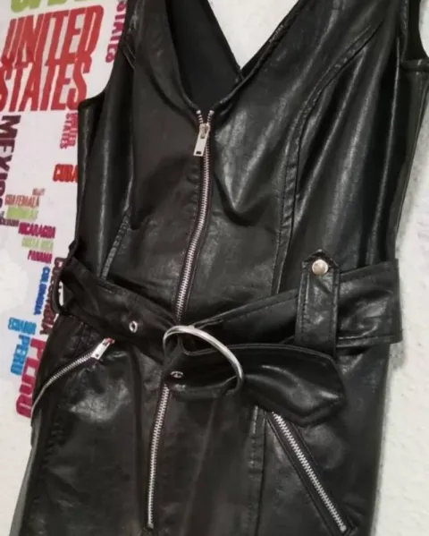 VESTIDO NEGRO POLIPIEL🌟🌟. Vestido corto en color negro de POLIPIEL sin mangas con cierres en bolsillos falsos, con cinturón del mismo material y cinturón ajustable hace súper buena figura