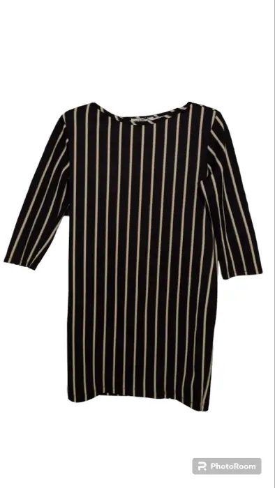 Vestido negro rayado, t/m. Vestido negro con rayas, a la rodilla, recto,cuello redondo, mangas largas, sin cierre.
