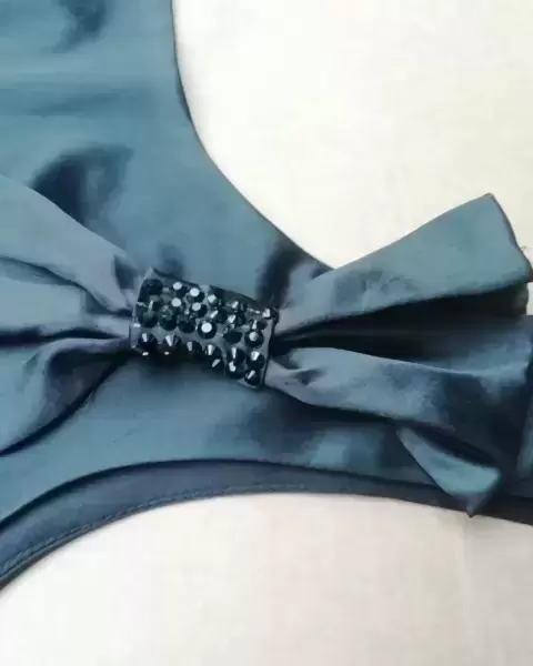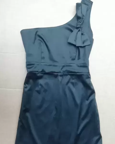 Bonito vestido negro de seda, marca Shasa! Elegante cuánta con un moño en el hombro y con piedras brillantes, el largo es a la rodilla o un poco arriba de la rodilla. Cuenta con cierre a un costado.