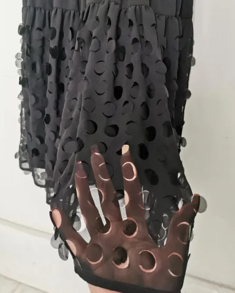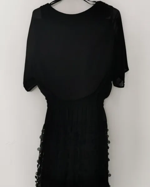 Vestido negro S.L.fashions. Vestido de tela de tipo chifón transparente. Tiene bajo vestido. La parte superior es tipo blusón. Cuello redondo. Con mangas murciélago con averturas a los lados. Lleva resorte a la cintura. Es zucida. Y la tela tiene un detalle tipo perforaciones. Talla M.