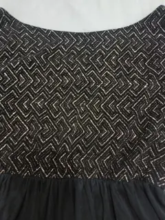 Vestido Negro combinados con tela con destellos brillantes color dorado mangas y falda transparente con forro en falda y elástico en corte falda y blusa