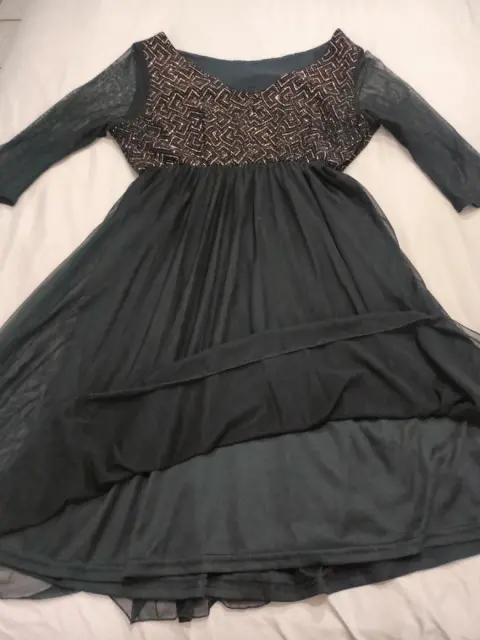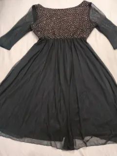 Vestido Negro talla 2XX. Vestido Negro combinados con tela con destellos brillantes color dorado mangas y falda transparente con forro en falda y elástico en corte falda y blusa