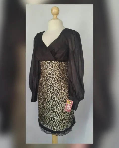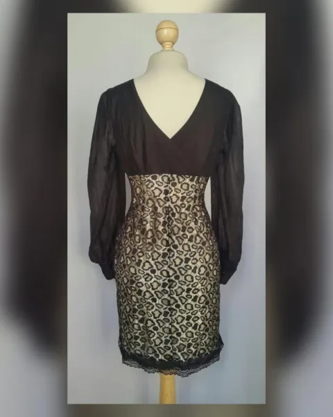 Vestido semi stretch de noche corte sheath tono NEGRO ÉBANO c/estampado ANIMAL PRINT bitono NEGRO/DORADO, escote cruzado, manga larga terminada en puño, cierre p/cremallera lateral y forro interior. Talla 32. Dimensiones cms: 35 hombro, 48 axila, 39 cintura, 50 cadera, 49 ruedo, 30 largo ruedo, 59 largo, 89 largo total, 64 largo manga. 78% poliéster, 19% rayón, 3% spandex. P/lavado en casa.