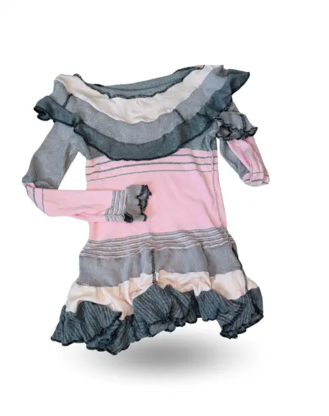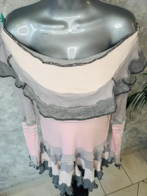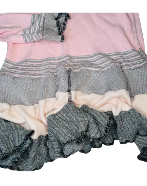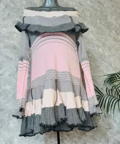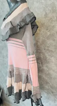 Vestido desombrado estilo gótico Coquette.Da la impresión como si fueran retazos de tela al revés.Tejido de punto y partes brillosas, rosa con gris.La parte de los hombros es muy escotadaTalla XL