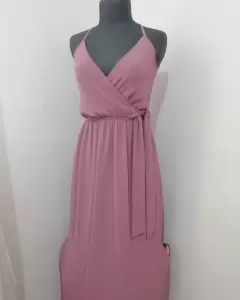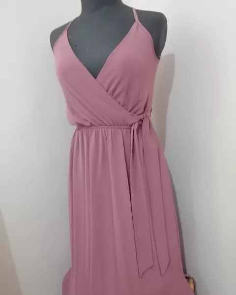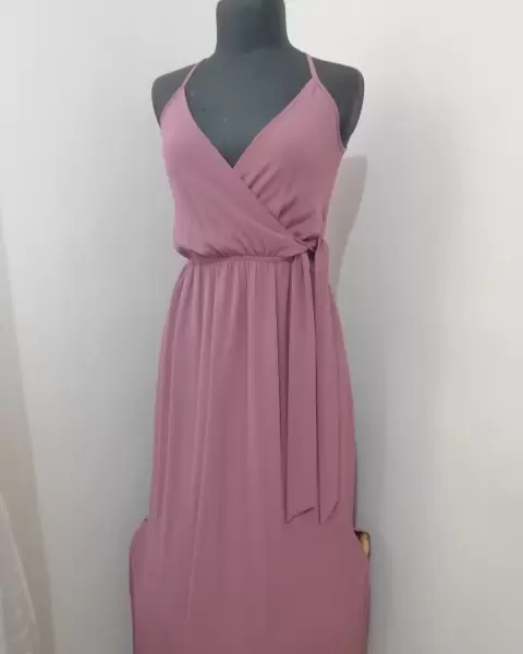 Precioso y ligero vestido color palo de rosa, de tirantes, largo y con forro fresco, escote en "V".