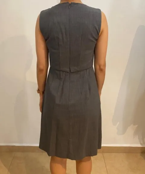 Vestido tipo ejecutivo, ajustado la tela no estira, super lindo. No tiene detalles.