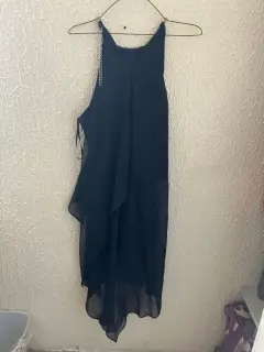 Vestido para fiesta. Vestido corto con tirantes de cadena , tipo halter ,caída esgada, corto .Color azul marino