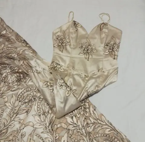 VESTIDO PARA FIESTA. Hermosos vestido, color champán con transparencias en bordado negro y dorado, straples tipo sirena, solo usado 1 vez. Está como nuevo, marca Ivonne