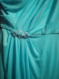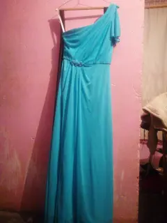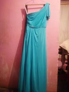 Vestido para fiesta. Largo, Azul claro, talla 32, adorno en la cintura, asimétrico, una manga