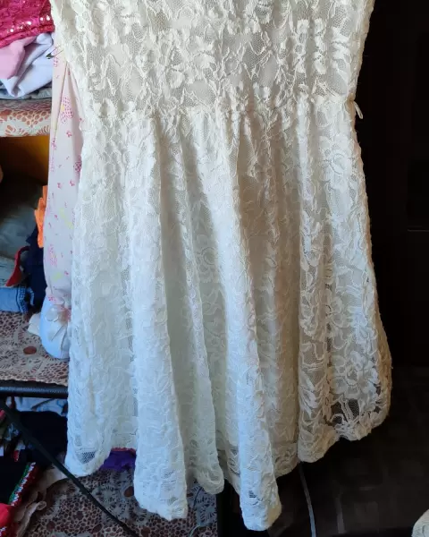 Vestido de encaje floral, con fondo de frente, transparente de atrás, sin ningún tipo de detalle, llega arriba de la rodilla.