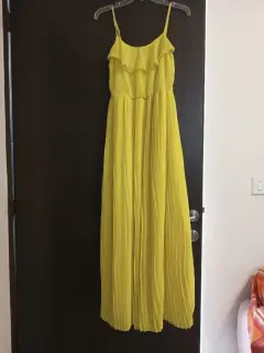Vestido casual amarillo, falda tablitas con forro y lindo olan en el pecho, tirante ajustable,