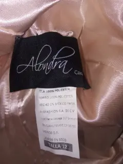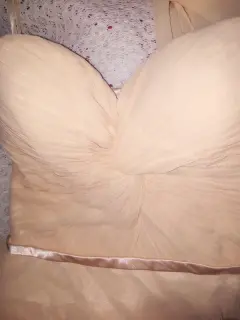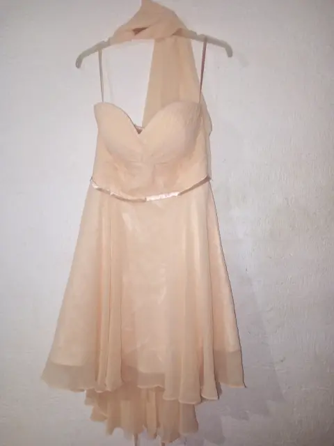Vestido para fiesta plisada anudado en el escote y cenefa en la cintura , descubierta la espalda y los hombros, cuenta con cierre, forro y bufanda de tul color Melocotón. De cintura 72 cm y de largo 70 cm de frente y 90 cm de atrás. Requiere tintorería.