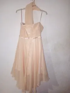 Vestido para fiesta corto escotada. Vestido para fiesta plisada anudado en el escote y cenefa en la cintura , descubierta la espalda y los hombros, cuenta con cierre, forro y bufanda de tul color Melocotón. De cintura 72 cm y de largo 70 cm de frente y 90 cm de atrás. Requiere tintorería.