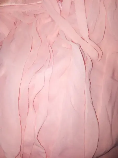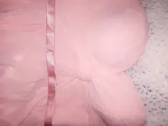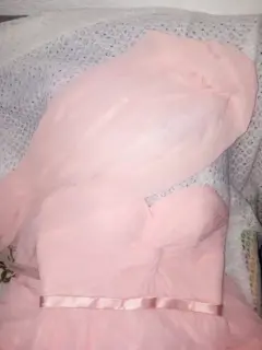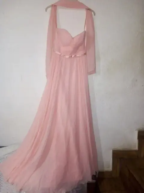 Vestido para fiesta largo con bufanda en tul en color Melocotón. De busto talla 32, de cintura 64 cm, largo de falda 103 cm, cuenta con forro, cierre y listón para ajustar prenda.