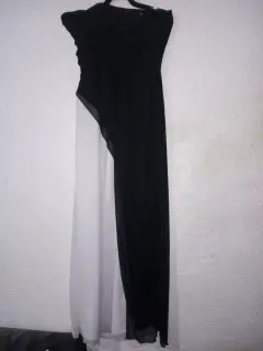 Vestido para fiesta sin tirantes ni mangas en color negro y blanco con brillos en frente del pecho hasta la cintura, mide de axila a axila 86 cm, de cintura 70 cm, de largo 126 cm.