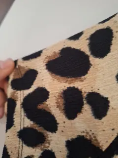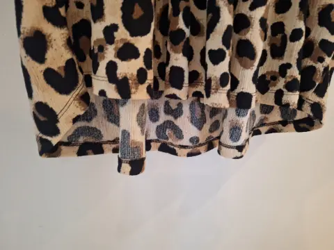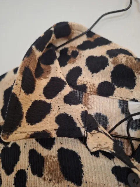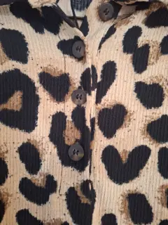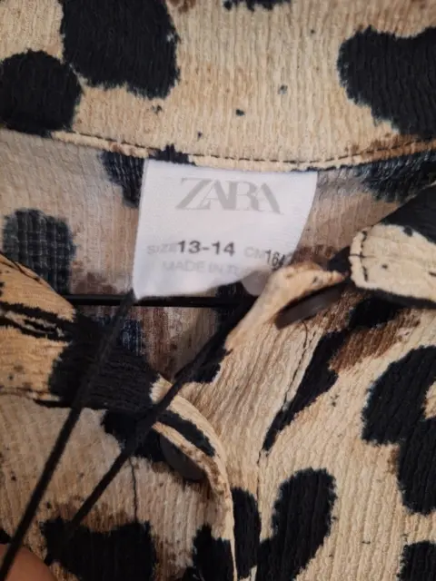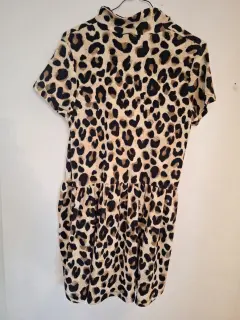 Vestido color beige con manchas negras y cafeces. Con cuello y botones para abrochar, talla 13-14