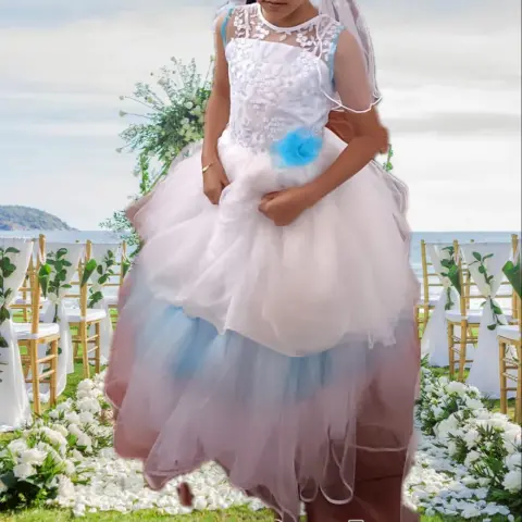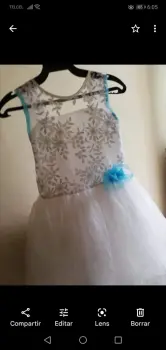 Vestido para primera comunión, talla 12 con detalles en azul que lo hace diferente y especial a lo cotidiano, una sola puesta, incluye velo con tocado con detalles florales azules.