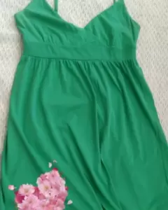 Vestido de algodón a la rodilla, color verde menta. Escote cruzado y tirantes ajustables. Tiene un detalle en la parte de atrás (ver foto)