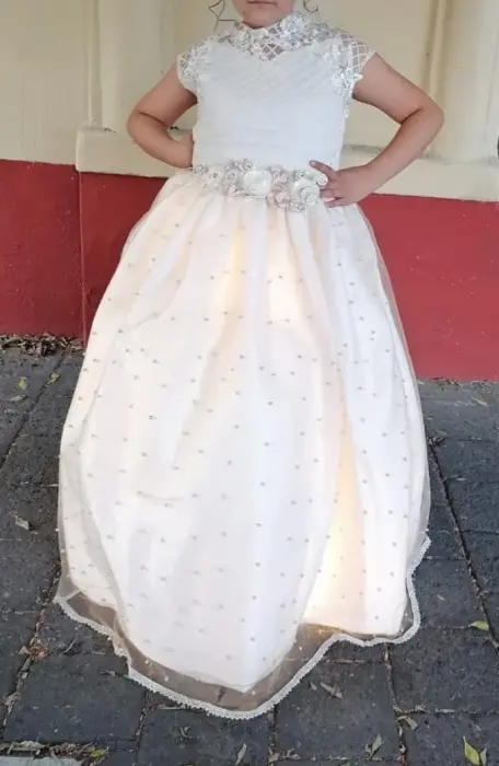 Vestido primera comunión. Vestido primera comunión color beige con destellos de perlitas y encaje en la parte de arriba