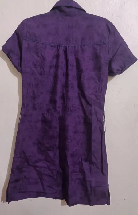 Vestido color morado, con estampado de bicicletas. Corto, manga corta y botones por delante, le falta la cinta, pero en excelente estado talla 28
