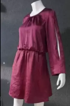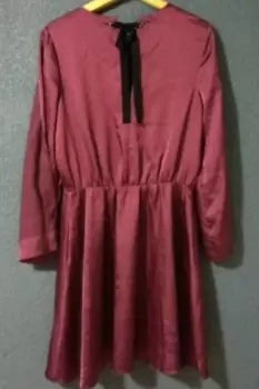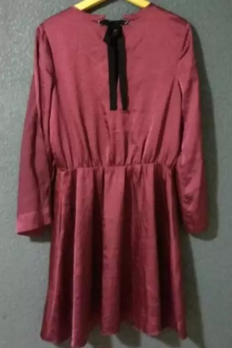 Vestido corto color vino, Talla- M con bolsas laterales, aberturas en mangas, Resorte en cintura y cinta de anudar en espalda.