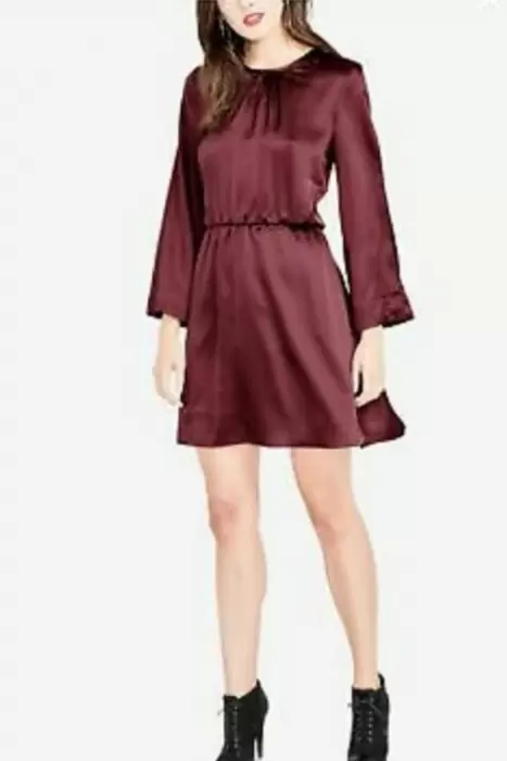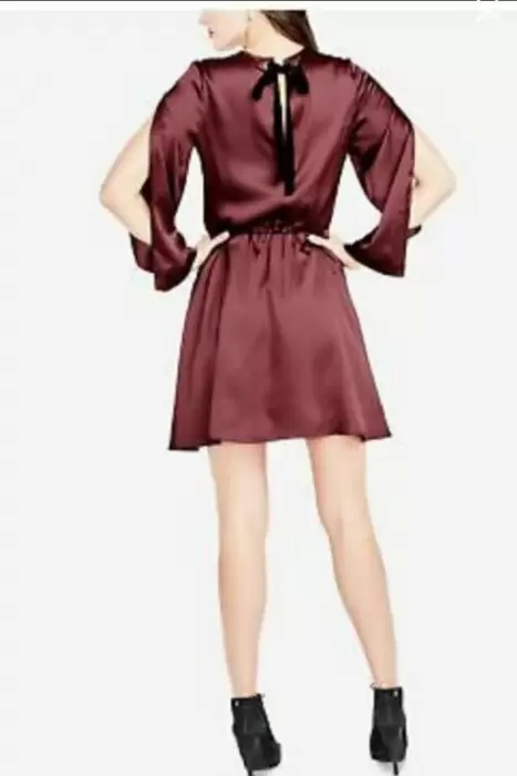 Vestido Rachel Roy. Vestido corto color vino, Talla- M con bolsas laterales, aberturas en mangas, Resorte en cintura y cinta de anudar en espalda.