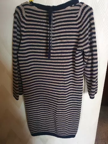Vestido rayado azul con café. Talla M. Benetton. Tela gruesa. Escote en forma de "v" con cierre en la parte de atrás. Vestido amplioMide 48 cms de axila a axila