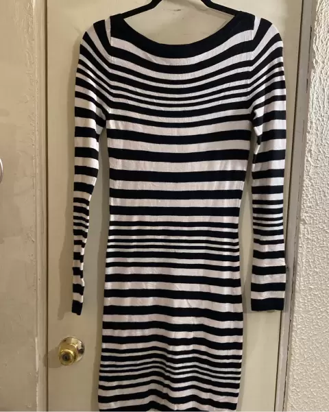Vestido rayado tipo sueter S. Vestido tipo sueter, manga larga, rayado blanco y negro, tela estira