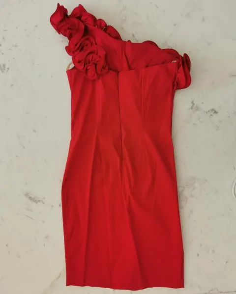 Vestido de tela tipo raso stretch. Color rojo. De un tirante. Con flores de tela al rededor del pecho y el tirante. Siper a la espalda. Talla S.