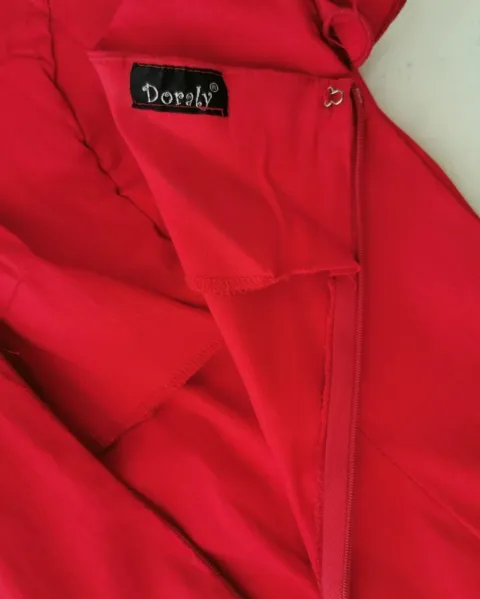 Vestido recto con flores Doraly. Vestido de tela tipo raso stretch. Color rojo. De un tirante. Con flores de tela al rededor del pecho y el tirante. Siper a la espalda. Talla S.