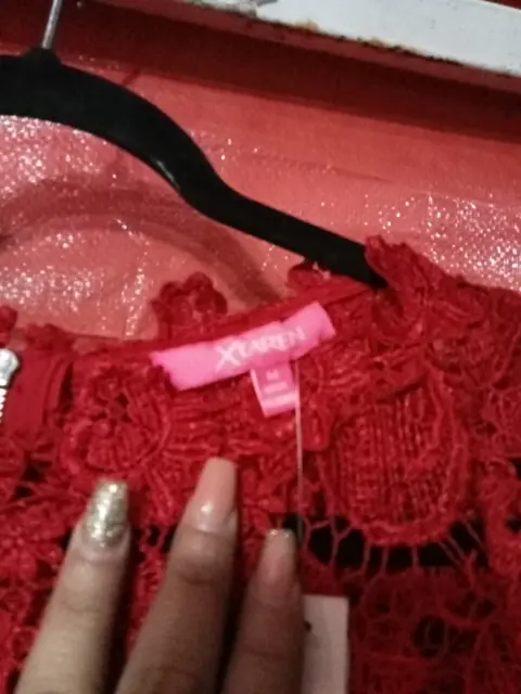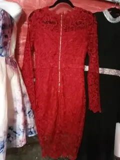 Vestido color rojo de encaje y fondo, manga larga, abajo de la rodilla, talla m