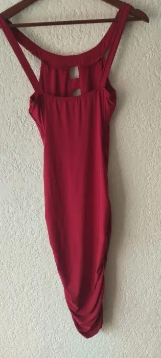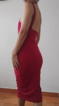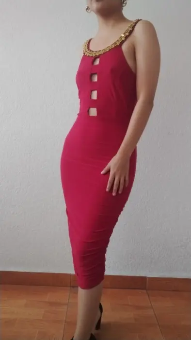 Talla SVestido rojo con detalles dorados en la parte del pecho.Es señido al cuerpo y con escote en la parte del pecho.La tela es Sueve pero estira muy poco.Ideal para salir de noche o a una fiesta