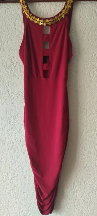 Vestido rojo. Talla SVestido rojo con detalles dorados en la parte del pecho.Es señido al cuerpo y con escote en la parte del pecho.La tela es Sueve pero estira muy poco.Ideal para salir de noche o a una fiesta