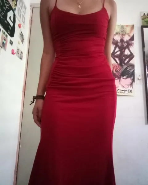 Vendedora con experienciaPrecioso vestido rojo, con abertura en la pierna y fruncido en el abdomen. Me encantaLa tela tiene brillitos y se ve increíble de noche