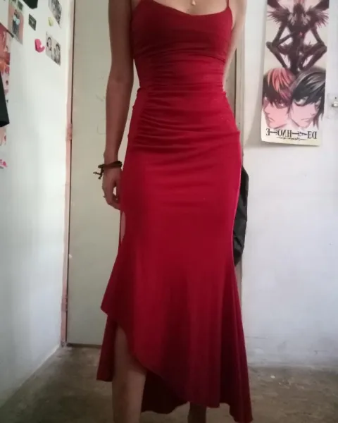Vestido rojo con abertura. Vendedora con experienciaPrecioso vestido rojo, con abertura en la pierna y fruncido en el abdomen. Me encantaLa tela tiene brillitos y se ve increíble de noche