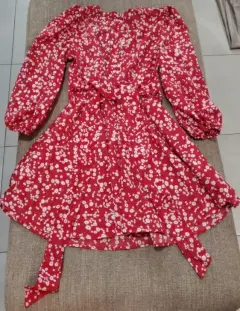 Vestido corto talla S, volado, rojo brillante con detalles en blanco, escote en V pronunciado, con listones para ajustar a la cintura, tela delgada pero no transparenta.