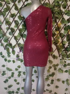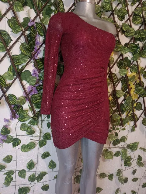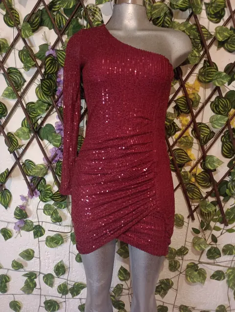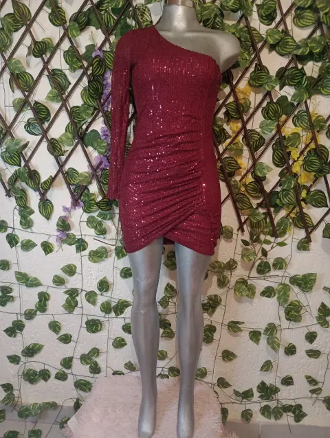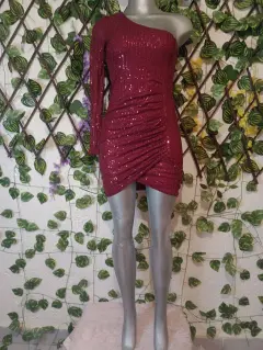 Vestido rojo con lentejuelas de fiesta talla chica con strech marca blanco y negro, con escote de hombro descubierto