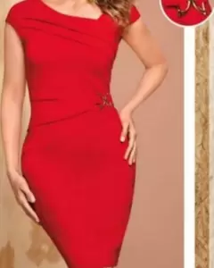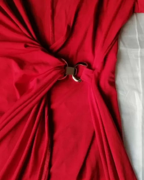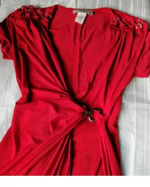 Hermoso vestido de licra color rojo con Aplicaciones metálicas en dorado, tiene una hermosa falda en tulipan que ajusta perfecto al cuerpo, talla mediana tal vez pueda quedar a L, ya que la tela estira, esta totalmente nuevo
