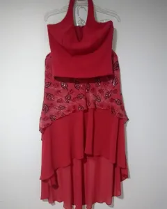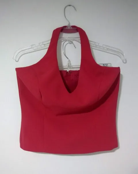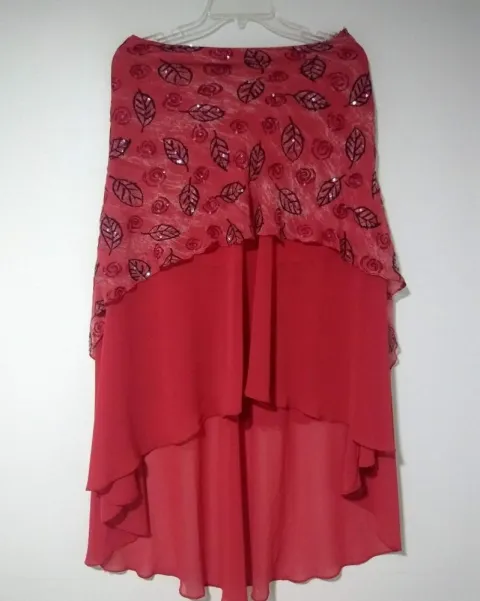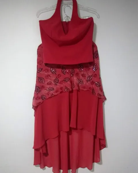 Vestido Rojo de 2piezas, Top Halter forrado con cierre en la espalda, varillas a los costados y Falda con cola, de telas vaporosas la de encima estampada con lentejuelas, las telas no estiran, no tiene etiqueta, es como talla M, 9 o 7, ancho Axila=43cm, ancho Cintura Top=42cm, Largo Top=53cm, ancho Cintura Falda=38cm, ancho Cadera=60cm, Largo Falda=62 y 104cm, Te regalo $100 con mi código de descuento si es tu primera compra iuNisj3oSQ