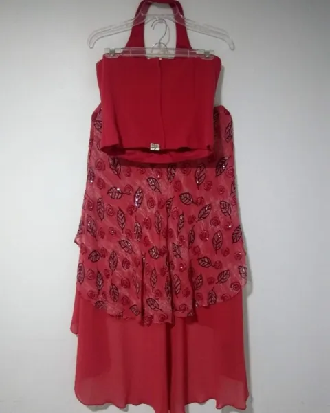 Vestido Rojo en dos piezas. Vestido Rojo de 2piezas, Top Halter forrado con cierre en la espalda, varillas a los costados y Falda con cola, de telas vaporosas la de encima estampada con lentejuelas, las telas no estiran, no tiene etiqueta, es como talla M, 9 o 7, ancho Axila=43cm, ancho Cintura Top=42cm, Largo Top=53cm, ancho Cintura Falda=38cm, ancho Cadera=60cm, Largo Falda=62 y 104cm, Te regalo $100 con mi código de descuento si es tu primera compra iuNisj3oSQ